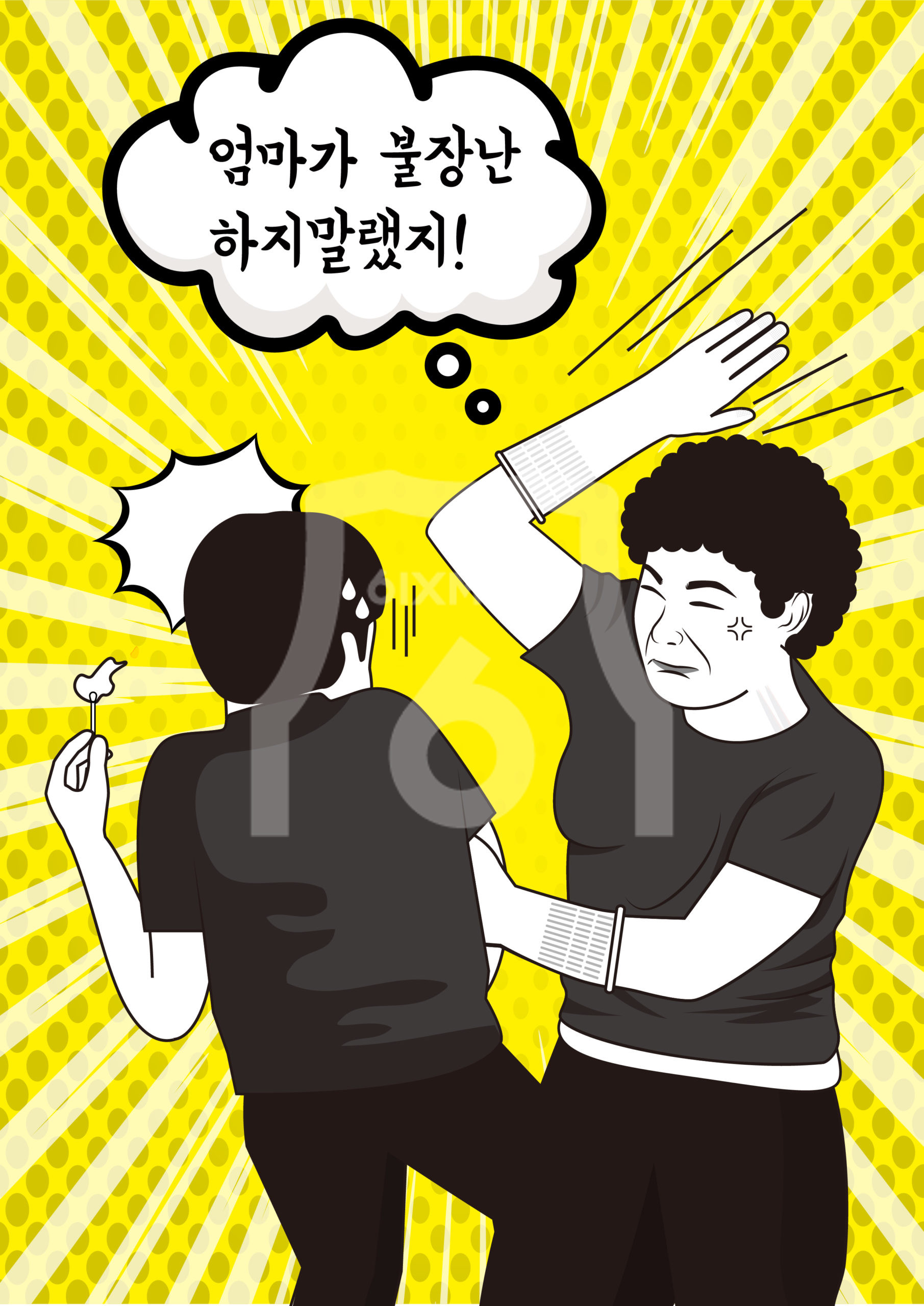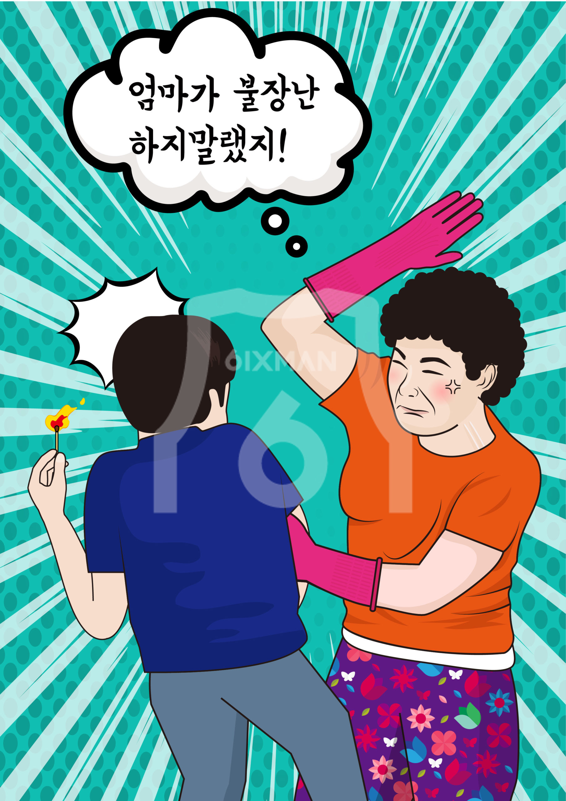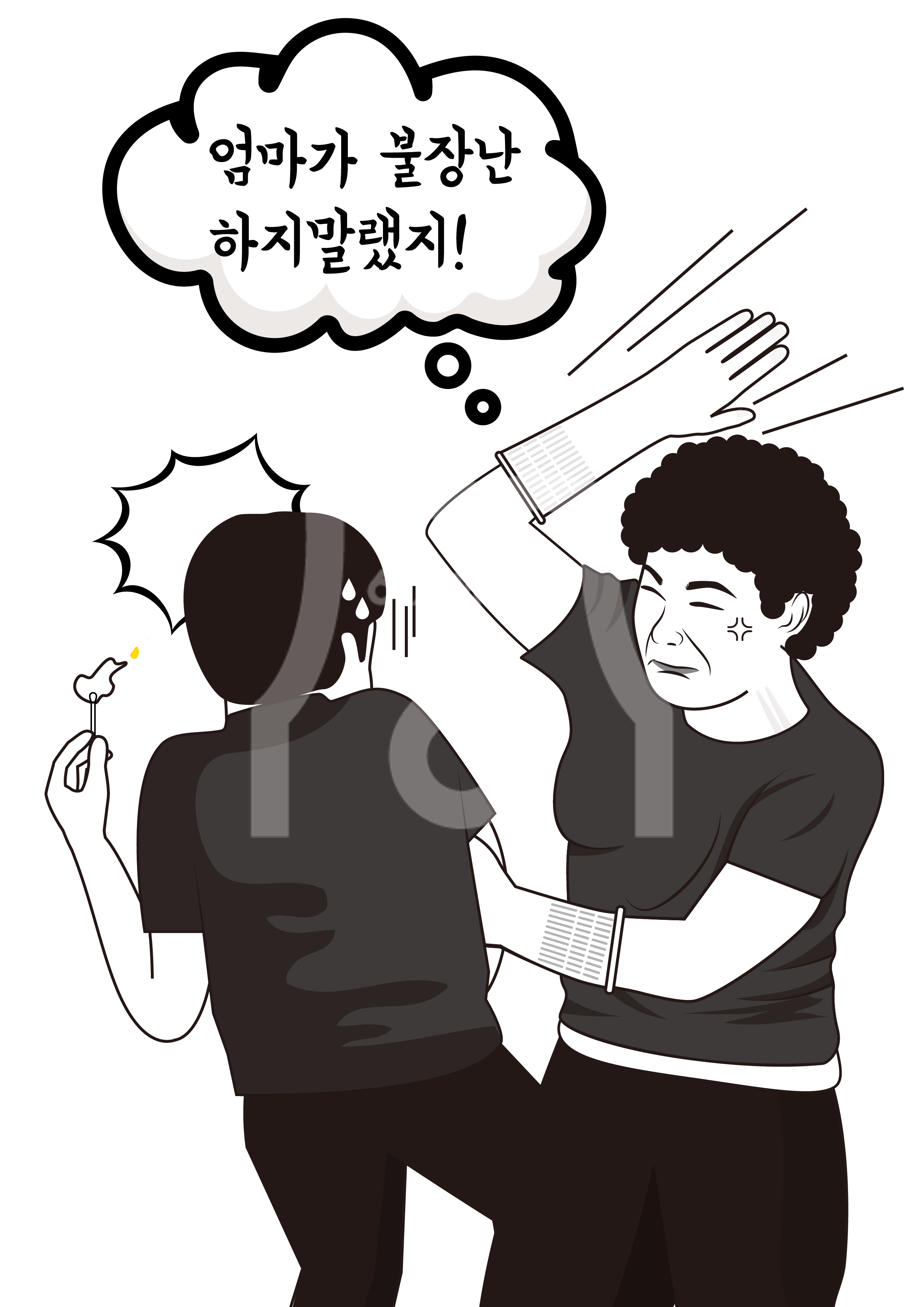 [KR] 안녕하세요. 디자이너 타미입니다. 위의 컨텐츠는 포트폴리오 입니다. 불장난 하는 아들에게 엄마가 손바닥 스매싱을 하는 장면을 그려달라는 의뢰가 들어와서 그린 일러스트 이미지입니다. 재미있는 컨셉으로 특정 행동을 강조하는 사실적 일러스트 이미지입니다.